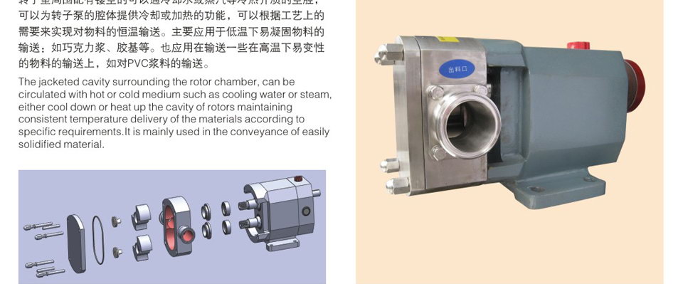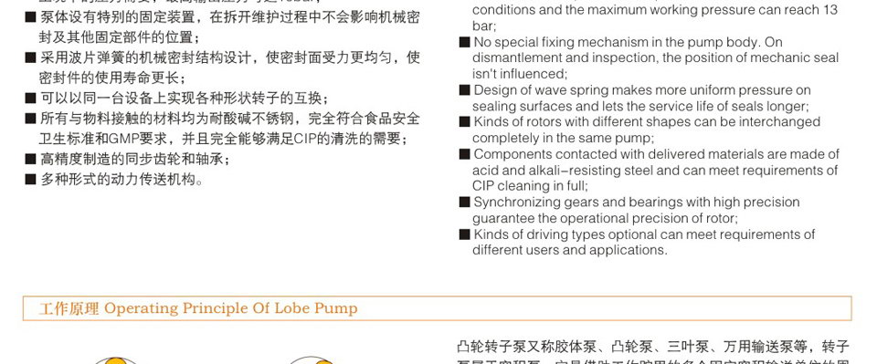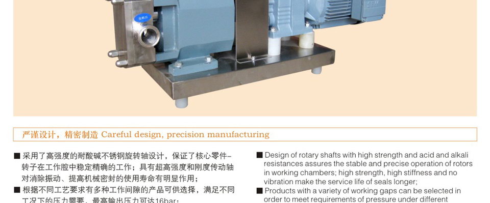 6、轉(zhuǎn)子和轉(zhuǎn)子之間絕無接觸,長期使用亦無磨損,運(yùn)轉(zhuǎn)平穩(wěn),噪音低,效益高。 7、設(shè)計新穎、安裝維護(hù)簡單容易,方便清洗,保證機(jī)器內(nèi)部和生產(chǎn)衛(wèi)生清潔。